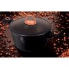 Disfruta momentos inolvidables junto a tu familia y amigos degustando deliciosas comidas cocinadas con la batería de cocina de alta gama Black Rose. Está formada por 3 cacerolas todas con tapa y 2 sartenes que cubrirán todas tus necesidades a la hora de preparar guisos, calentar comida, cocinar salteados o carnes y pescados a la plancha. Además incluye 2 salvamanteles.Fabricada en aluminio forjado de gran calidad, se caracteriza por un diseño elegante y atractivo en acabado negro mate con detalles de acero en color oro rosa. El revestimiento antiadherente Titanio de 3 capas permite cocinar con muy poco aceite y es increíblemente resistente y duradero. Utilizamos una nueva tecnología para crear revestimientos eco-friendly, saludables y completamente seguros y 100% libres de PFOA, plomo y cadmio. Su fondo de inducción turbo proporciona tiempos de cocción un 35% más rápido consiguiendo un ahorro de energía.El juego de cazuelas y sartenes se puede utilizar en todo tipo de cocinas: Vitrocerámica, Eléctrica, Gas y Cocinas de Inducción. También son aptas para el lavavajillas.Las tapas de las cacerolas son de vidrio templado pomos de acero inoxidable color rose gold. Las asas son ergonómicas de tacto suave y frío por lo que ofrecen un agarre cómodo y mantienen tus manos a salvo de las quemaduras.CARACTERÍSTICASCazuelas y sartenes en Aluminio Forjado de pared gruesa:Antiadherente Titanio 3 capas.100% libre de PFOA, Plomo y Cadmio.Fondo Turbo Inducción ahorra energía.Apta para todo tipo de cocinas: Inducción, Vitrocerámica, Gas, Eléctrica.Apta para lavavajillas.Color: Negro mate – Oro Rosa.COMPOSICIONCacerola Ø20*10,4 cm 2,5L.Cacerola Ø24 * 11,8 cm 4,1L.Cacerola Ø28 * 12,4 cm 6,1L.3 Tapas de vidrio templado con pomo de acero inoxidable color oro rosa.Sartén Ø20 * 4,5 cm 1,3L.Sartén honda Ø24 * 6,5 cm 2,3L.2 Salvamanteles de baquelita.