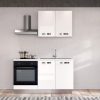 Cocina GILDA ICE Derecha 150×216 cm. Blanco brillo/Gris claro. Se compone de 3 módulos, fregadero, grifo, campana, placa y horno. Sus módulos están fabricados en panel de partículas. Puertas y cajones soft close. Se compone de base de fregadero de 90 cm con 2 puertas, base de horno de 60 cm y mueble de pared escurreplatos 90 cm con 2 puertas.Campana extractora KUMTEL DK6-731. Eficiencia energética D (A+++ a D). 2 Motores. Potencia 140W. Capacidad de ventilación intensiva: 300 m3/h. Control mediante botones. 3 Velocidades. Filtro de aluminio lavable en lavavajillas, Iluminación led. La campana incluye el tubo / chimenea por encima del motor. Inox Medidas: 59,8 an x 15 al x 48,4 fon cmPlaca Vitrocerámica CANDY CH64XB: 4 Zonas de cocción. Control táctil. 10 Niveles de potencia. Temporizador. Color negro. Medidas: 59 an x 4 al x 52,6 fon cm.Horno convencional CANDY FIDCN200 con ventilador de enfriamiento. Eficiencia energética A (A+++ a D). 70 Litros de capacidad. Controles mecánicos. 4 Funciones. Limpieza aquactiva. Accesorios: 1 rejilla y 1 bandeja. Color negro: 59,5 an x 59,5 al x 56,8 fon cm.