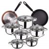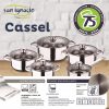 Batería de cocina de 12 piezas, compuesta por:1PC Cazo con tapa Ø14 cm aprox. 0.9L /1PC Cacerola con tapa Ø14 cm aprox. 0.9L /1PC Cacerola con tapa Ø16 cm aprox. 1,4L / 1PC Cacerola con tapa Ø18 cm aprox. 2,0L/1PC Cacerola con tapa Ø20 cm aprox. 2,8L/1PC Cacerola con tapa Ø24 cm aprox. 4,5L.El set ha sido fabricado en acero inoxidable de alta calidad, aportando una resistencia perfecta a las piezas y mayor vida útil. El fondo de inducción que incorpora ha sido diseñado para ofrecer un calentamiento rápido y homogéneo, ahorrando tiempo y energía. Es compatible con todas las cocinas, incluidas la de inducción. Las tapas han sido fabricadas en vidrio de gran resistencia. Gracias a su transparencia podrás ver el estado de las recetas sin necesidad de levantarla.El juego de baterías de cocina Cassel ha sido diseñado en acero inoxidable de alta calidad, aportando una resistencia perfecta y una mayor vida útil de cada pieza. Compuesta por un cazo y tres cacerolas con tapa, las piezas incorporan en el interior una escala de medición que hace mucho más sencilla la cocina. El fondo de inducción del que están provistas las piezas aporta una conducción rápida del calor de manera homogénea por toda la base. Compatible con todas las cocinas, incluidas las de inducción. Las asas han sido elaboradas en una forma ergonómica para ofrecer un agarre cómodo y seguro de la pieza. Además, el set se completa con las tapas de vidrio de gran resistencia. Una transparencia perfecta que te permitirá ver el estado de la cocción sin necesidad de levantar la tapa.Y fantástico set que se compone de:Impresionante juego de sartenes exclusivo de la colección San Ignacio Premium, combinando la elegancia y prestaciones para tu cocina.Esta set de sartenes de Ø20×4,2 cms. y Ø24×4,7 cms. está fabricada en aluminio forjado, lo cual te va a dar grandes resultados y ahorro energético, ya que este material adquiere y distribuye el calor del fuego rápidamente.Presenta una base de 3mm y un cuerpo de 4 mm que la hacen ideal para cocciones cortas, freir y saltear, y está especialmente diseñada para dar resultados incluso en inducción a poca potencia.Dispone de un interior antiadherente en mármol en negro, moteada en amarillo y gris, y un espectacular exterior en aspecto de cobre metalizado.El mango es de hierro con silicona, lo cual va a favorecer el agarre y la manejabilidad, además de que va a permanecer frío mientras cocinas, asegurándote comodidad y evitando quemaduras.El fondo, por supuesto, es apto para todo tipo de fuegos, incluyendo el de inducción.Una exclusiva de la colección San Ignacio Premium.