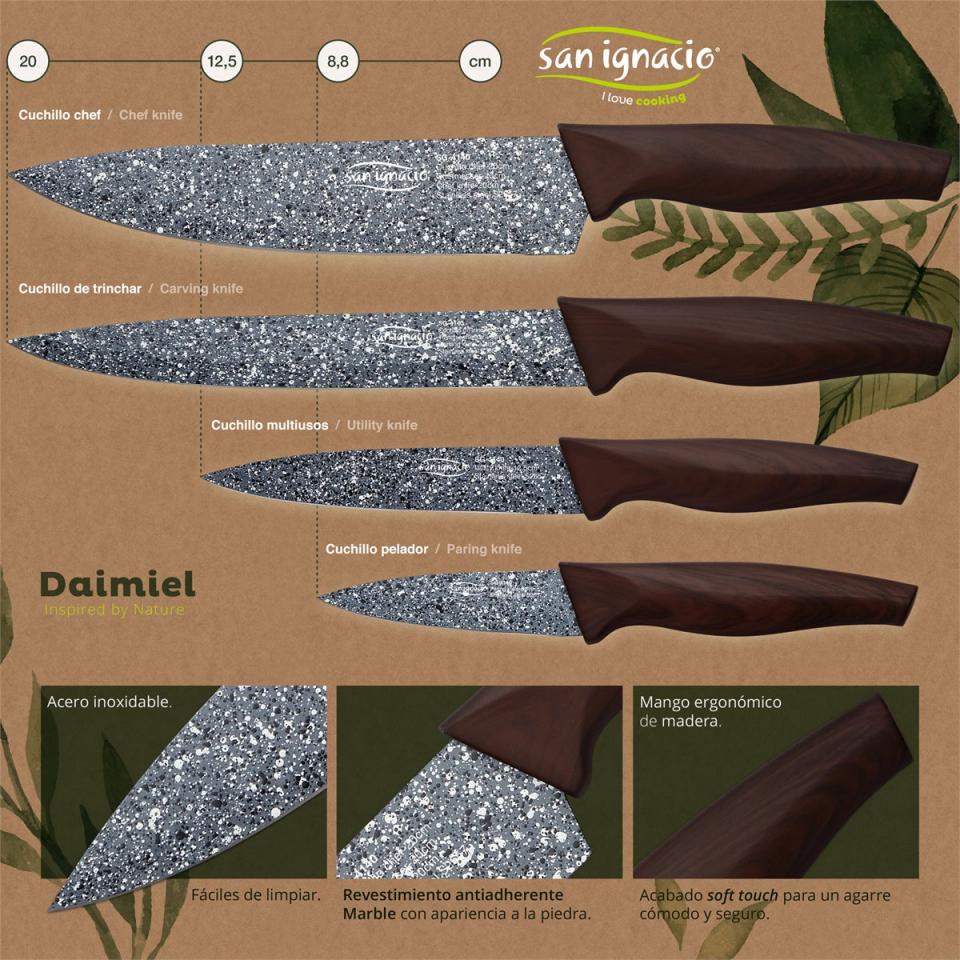 Set De Cocina Compuesto Por:• Excepcional Batería De 8 Piezas De San Ignacio.Se Compone De 4 Cacerolas Con Sus Respectivas Tapas De Vidrio.Fabricadas En Acero Inoxidable 201, Con Un Estudiado Grosor De 0,35 Mm. Para Una Efectiva Y Rápida Distribución Del Calor.Las Dimensiones De Las Ollas Son Ideales: Ø16X9,5; Ø18X10,5; Ø20X11,5 Y Ø24X13,5 Cms.Y Sus Capacidades, 1,9 L; 2,7 L; 3,5 L; Y 5,1 Litros, Ideales.Dispone De Unos Espectaculares Asas Y Pomos En Contraste Oscurecido, Para Un Cuerpo Cromado, Con El Detalle De Tres Elegantes Líneas Satinadas. Las Tapas Disponen De Válvula Para Escape Del Vapor, Y Al Ser De Cristal, Puedes Vigilar La Cocción Sin Necesidad De Destapar.Escala Medidora En El Interior.Por Supuesto, Aptas Para Todo Tipo De Fuegos, Incluído El De Inducción.• Set De 4 Cuchillos De Cocina Daimiel.Fabricada En Los Mejores Materiales Para Una Resistencia Y Eficiencia Inigualable.Una Colección Que Combina El Aspecto De La Piedra Con Un Mango De Efecto Madera Para Una Cocina Elegante Y Natural.Fabricado En Acero Inoxidable.Revestimiento Marble Con Pequeñas Motas En Color.Mango De Madera Con Acabado Tacto Suave.Daimiel Busca Inspirarte En Una Cocina Sana Y Natural.Su Set De Cuchillos Ha Sido Diseñado En Acero Inoxidable De Alta Calidad Para Ofrecerte La Mejor Resistencia.Un Material Excelente Que Se Combina Con El Mejor Revestimiento Marble Para Un Corte Casi Sin Esfuerzo Y Que Otorga Una Apariencia A La Hoja Parecida A La Piedra.Las Piezas Se Completan Con Un Mango De Madera De Acabado Soft Touch Para Un Agarre Cómodo Y Seguro.Usa El Cuchillo Chef Para Cortar Y Trocear Desde Vegetales, Carne O Pescado.El Cuchillo Trinchador Ofrece Un Diseño Inmejorable Para Cortar La Carne.Pela Tus Ingredientes Con El Cuchillo Pelador Y Trocea O Corta La Pieza Sin Piel Con El Cuchillo Multiusos.Todas Las Necesidades En Un Solo Set Gracias A La Colección Daimiel.Se Compone De:-1 Cuchillo Chef: 31,5 Cms (Filo 20 Cm).-1 Cuchillo Deshuesador: 31,5 Cms (Filo 20 Cm).-1 Cuchillo Multiusos: 23 Cms (Filo 12,5 Cm).-1 Cuchillo Pelador: 19 Cms (Filo 9 Cm).