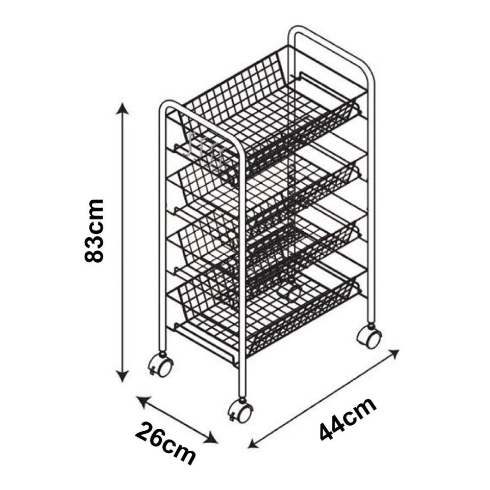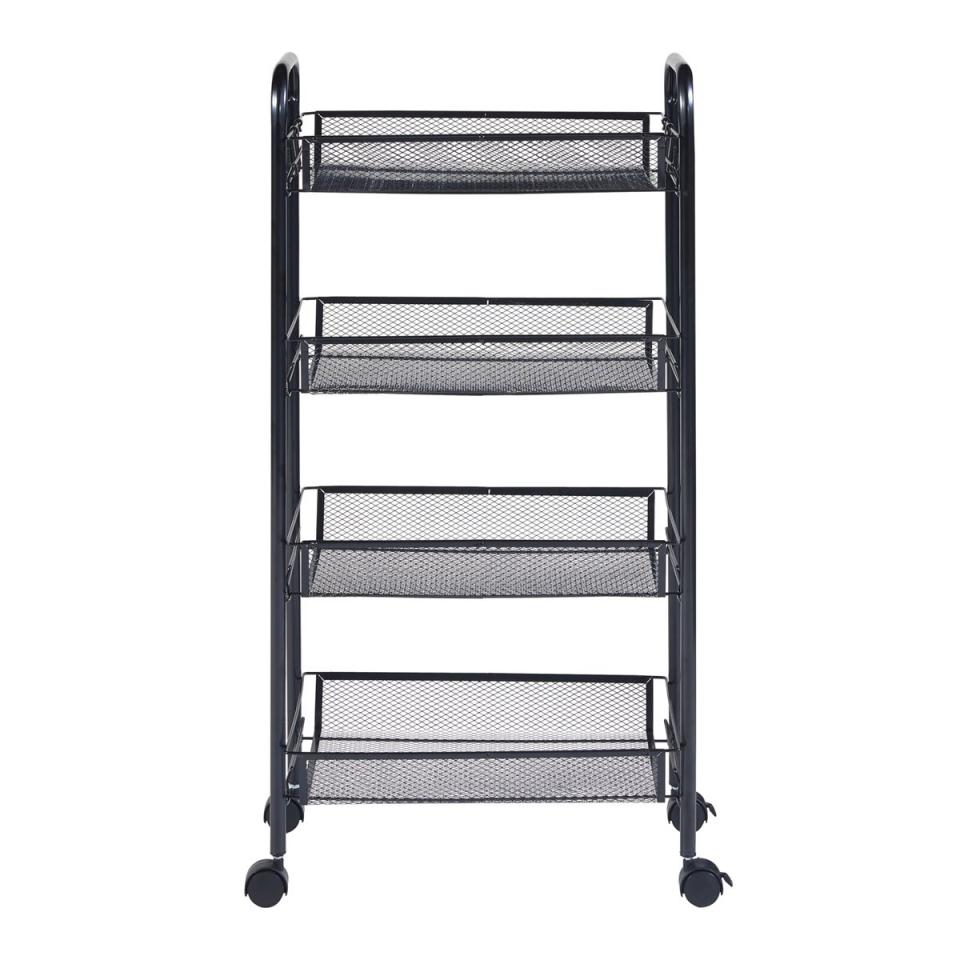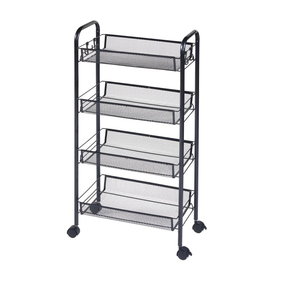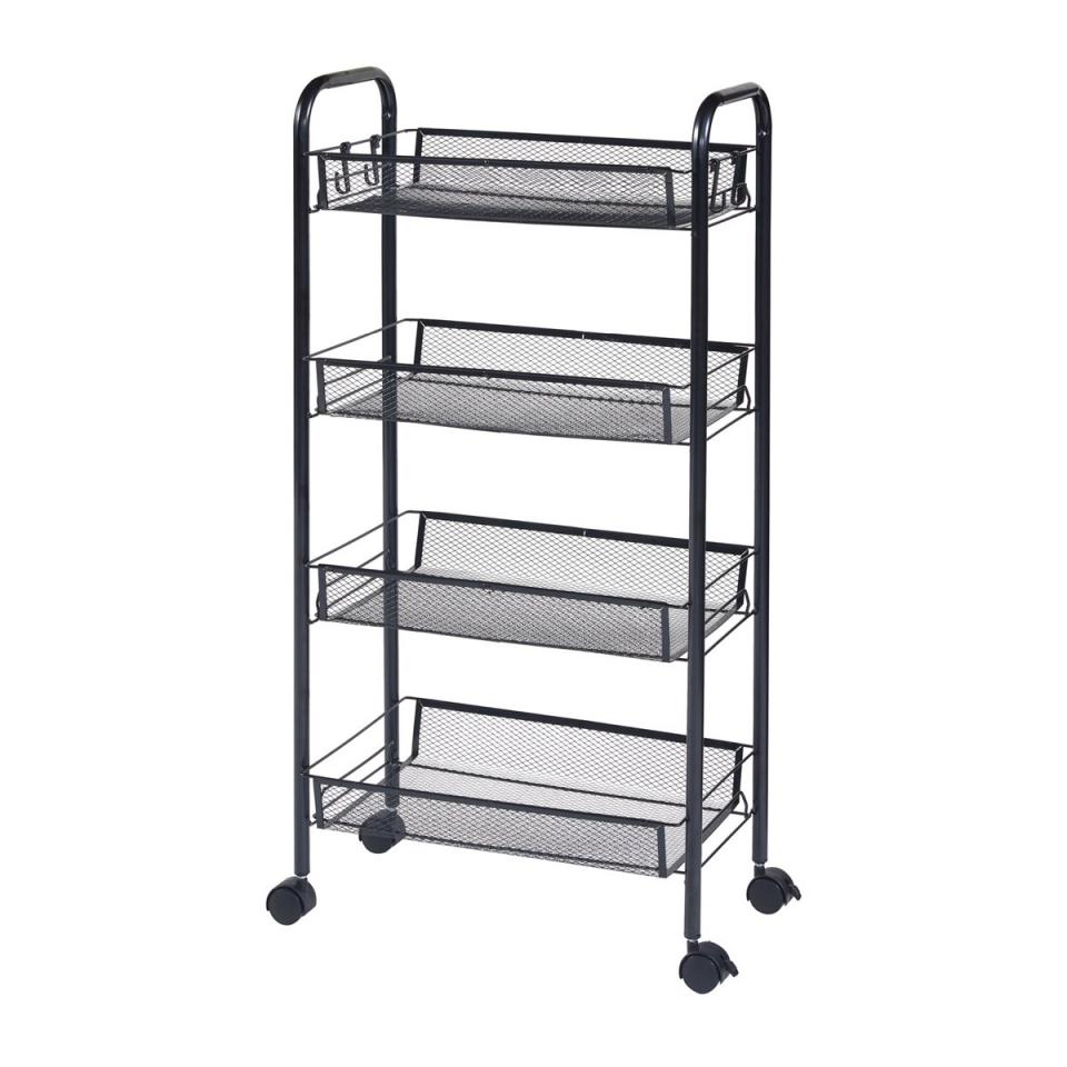 Carrito de cocinaEl carro de servicio TROMSØ es una solución versátil y práctica para organizar su espacio en el hogar o en la oficina. Con cuatro ruedas de marcha suave, se mueve fácilmente entre habitaciones.Con 4 cestas rectangulares, este carro ofrece la solución perfecta para organizar vajilla, bebidas y snacks, siempre listos para ser alcanzados. Las paredes perforadas de las cestas proporcionan una ventilación óptima, convirtiéndolo en un espacio idóneo para almacenar verduras y frutas frescas. Además, cuenta con cuatro ganchos para colgar toallas, manoplas de horno u otros accesorios.La capacidad de desplazarse sin esfuerzo y fijarse de manera segura convierte a este carro en un elemento indispensable en tu hogar. Aunque su función principal es en la cocina, donde facilita el transporte de alimentos y utensilios, también es una adición perfecta para el cuarto de baño para almacenar productos de cuidado y utensilios esenciales.Capacidad de carga hasta 3 kg / cestaDescripción del producto:- multiuso, se puede usar en la cocina, oficina- cestas para utensilios, frutas y material de oficina – con 4 ganchos para colgar toallas, agarraderas- ideal para servir comidas y bebidas- ventilación óptima gracias a las paredes perforadas de la cesta- práctico, si necesitas más espacio de almacenamiento- se adapta a varios estilos de interior- fácil de mover gracias a las 4 ruedas- con 2 ruedas bloqueablesMedidas (AlxAnxPr):83 x 44 x 26 cmMaterial: aceroColor: negroEnvío incluye:1x carro de servicioProducto de la marca [en.casa].