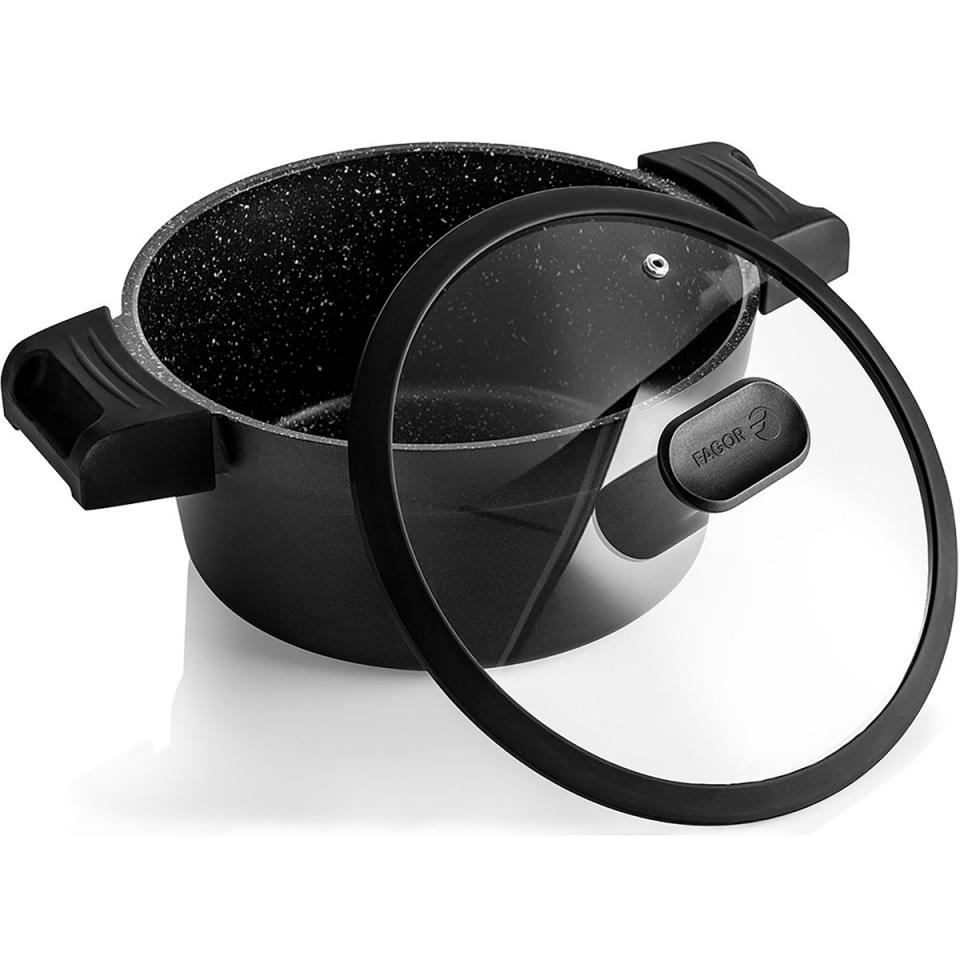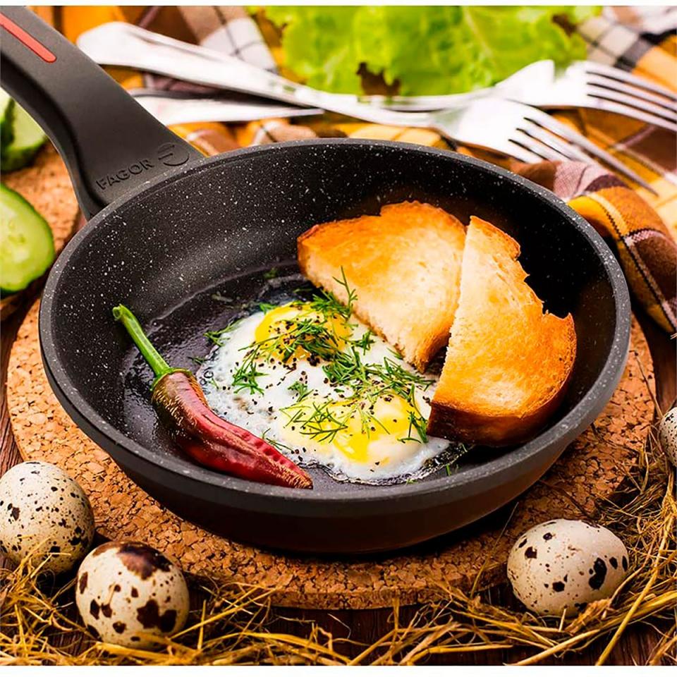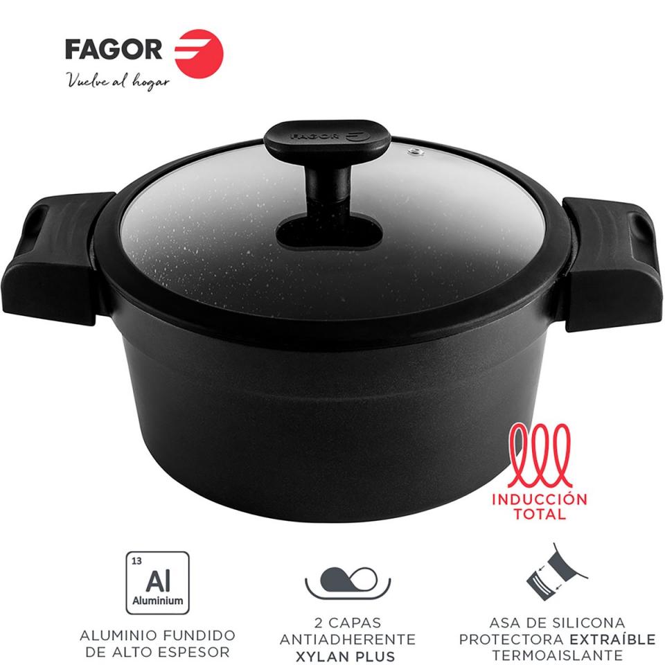 La batería de cocina Fagor Alutherm no solo te ayuda a cocinar tus alimentos, también reduce el tiempo de cocinado conservando la calidad de los alimentos y ahorrando energía.CARACTERÍSTICAS:Aluminio fundido Alutherm: Batería de cocina de alta calidad, fabricada en aluminio fundido inyectado a presión de alto espesor (5,3mm en base y borde). Su alta densidad otorga al producto una mayor dureza, resistencia al uso y distribución del calor eficiente.Antiadherente doble capa: El antiadherente XYLAN PLUS de doble capa reforzado efecto granito, incrementa la durabilidad del producto y facilita su limpieza. Antiadherente ecológico fabricado sin PFOA libre de metales pesados.Inducción: El fondo difusor IMPAKSTEEL incorpora un disco de acero inoxidable magnético en toda la superficie para una óptima difusión del calor en cocinas de Inducción.Apta todo tipo de cocinas: Es apta para todo tipo de cocinas: Vitrocerámica, Gas, Eléctrica, Inducción. Se limpia fácilmente y son aptas para limpieza en lavavajillas.5 Piezas: Batería compuesta por: Cacerola Ø 20 cm; Cacerola Ø 24 cm ambas con tapa de vidrio templado termorresistente con con cerquillo de silicona y válvula para la salida de vapor y 1 sartén de Ø 24 cm.Tapas de Vidrio: Las ollas incluyen tapa de vidrio templado termorresistente con con cerquillo de silicona y válvula para la salida de vapor.Asas de Baquelita / Silicona: Los mangos de baquelita (sartenes) y las asas de silicona extraíbles (cazuelas) son ergonómicas, termorresistentes y de tacto suave y frío por lo que ofrecen un agarre cómodo y mantienen tus manos a salvo de las quemaduras.ESPECIFICACIONES:Aluminio fundido de alto espesor (5.3 mm en base y borde).Antiadherente moteado de doble capa Xylan Plus.Fondo difusor ImpakSteel con disco de acero de 0.7 mm. fabricado por impacto.Aptas para todo tipo de cocinas: Vitrocerámica, Gas, Eléctrica, Inducción.Antiadherente fabricado SIN PFOA / PTFE libre de metales pesados.Tapa de vidrio termorresistente con cerquillo de silicona y válvula de vapor.Sartenes con mango de Baquelita.Cazuelas con asas de silicona termoaislante extraíbles.Apta para lavavajillas.Fácil limpieza.Fabricado en España.