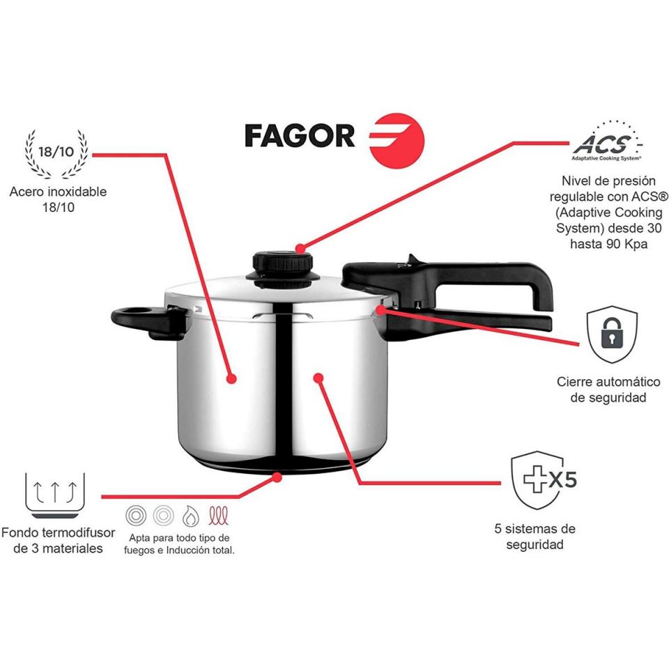 Dual Xpress es la olla más moderna, rápida y saludable. La preparación de los alimentos en esta olla a presión permite conservar la mayor parte de los nutrientes. Los tiempos de cocción convencionales se reducen hasta en un 70%, lo que le permite ahorrar energía.El novedoso control de presión progresivo ACS® (Adaptative Cooking System) nos permite preparar cada alimento, ya sean verduras, carnes, pescados o cualquier tipo de guisos con la presión adecuada pudiendo cocinar de forma tradicional, rápida y super-rápida.CARACTERÍSTICAS:Super rápida: Ofrece un regulador de presión progresiva circular para elegir entre Super Rápida (90 kPa) ideal para legumbres y carnes, y Rápida (30 kPa) recomendada para arroces y pescados. La cocción a presión conserva la mayor parte de nutrientes.Acero inoxidable 18/10: Está fabricada en acero inoxidable 18/10 de la más alta calidad muy resistente al desgaste. Fondo termo difusor de 3 capas (acero AISI 304 + aluminio 3003 + acero AISI 430) que optimiza la transmisión del calor. Apta para todo tipo de cocinas, incluida Inducción.Capacidad 6 litros: La olla de Ø 22cm con una altura de 17 cm, tiene una capacidad de 6 litros ideal para cocinar unas 6 raciones de comida. Tiene una práctica escala interna que facilita un llenado preciso y es apta para lavavajillas.Cestillo: Incluye un práctico cestillo de acero inoxidable que permite cocinar al vapor en la olla a presión, además de usarlo como colador para el caldo o el fumet de verduras o pescado, incluso para cocer huevos al mismo tiempo que las verduras.Eficiencia energética: Los tiempos de cocción se reducen hasta en un 70% con respecto a los tiempos de cocción convencionales, lo que a su vez permite ahorrar hasta el 50% de energía.5 Sistemas de seguridad: La olla dispone de 5 sistemas de seguridad: sensor de presión, cierre automático, válvula de trabajo, válvula de seguridad y ventana de seguridad. Mango ergonómico tipo bayoneta y asa fabricados en baquelita termo aislante.ESPECIFICACIONES:Acero inoxidable 18/10.Nivel de presión progresivo: Desde 30 kPa a 90 kPa. Todo tipo de cocinas: Tradicional – Rápida – Super-rápida.5 Sistemas de seguridad incluido bloqueo automático de la tapa.Mangos ergonómicos de baquelita termoaislante.Fondo termo difusor de 3 capas (acero AISI 304 + aluminio 3003 + acero AISI 430). Inducción total.Apta para todo tipo de fuegos:Inducción, Vitrocerámica, Gas, Elléctrica.Acabado interior satinado.Acabado exterior pulido espejo.