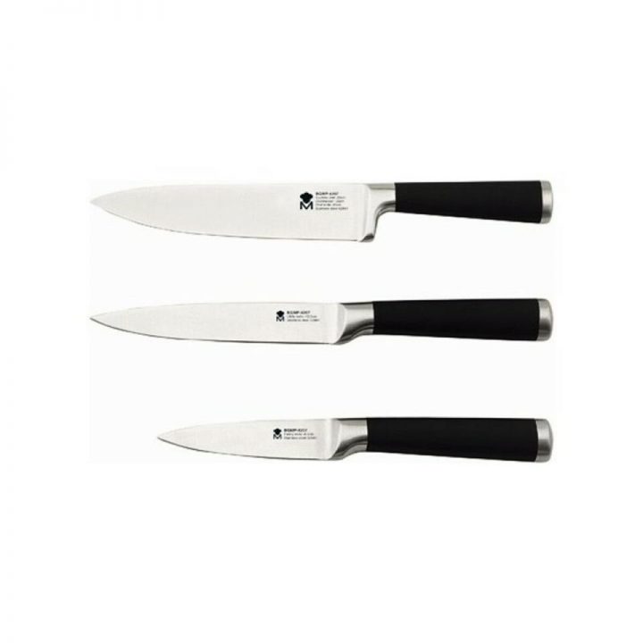 Si te gusta cuidar cada detalle de tu hogar y estar a la última en productos que te harán la vida más facil, compra Set de Cuchillos Masterpro Foodies Acero Inoxidable (3 pcs) al mejor precio. Color: NegroblackMaterial: Acero InoxidableCaracterísticas: Apto para lavavajillasApto para lavavajillasErgonómicoPiezas: 3 Piezas3 pcsMango ergonómico: mayor agarre y mejor manejoPropiedades: Gran calidad, resistencia y durabilidadIncluye: Cuchillo ChefCuchillo PeladorCuchillo Universal MultiusoLongitud de la hoja del cuchillo: 20 cm12,5 cm8,7 cmEste kit de cuchillos forma parte de la colección de Foodies de Masterpro. Incluye 1 cuchillo para chef de 20 cm, 1 utensilio multiusos de 12.5 cm y 1 pieza para pelar de 8.75 cm. Disponen de un mango ergonómico de superficie suave que provee un agarre estable durante largos periodos de uso. Hojas fabricadas en acero inoxidable de alta calidad. La empuñadura está revestida en silicona termorresistente. El filo de estas piezas se mantiene aún después de varios usos.La colección Foodies MasterPRO lleva hasta tu cocina los productos más profesionales. La tecnología culinaria más innovadora que te permitirá explorar tu creatividad y ofrecer a tus invitados unas recetas inigualables con un resultado digno de las mejores cocinas.Todos los productos de la colección Foodies MasterPRO han sido testados por la fundación Cook&Chef Institute, pasando una previamente auditoria de nuestros chefs, reforzando así la seguridad alimentaria en la cocina.