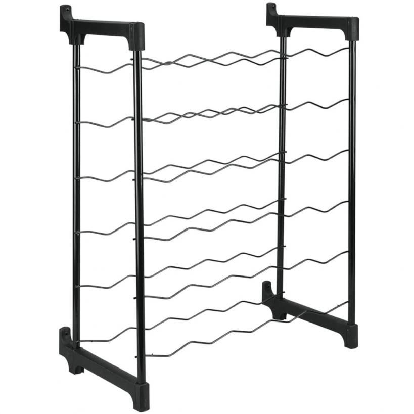 El botellero de Metaltex modelo Chianti es ideal para organizar y almacenar hasta 30 botellas de vino, jugo, refrescos, agua, etc. Este estante para vinos tiene un revestimiento exclusivo de Epotherm que lo hace antiestático, resitente al óxido y a los rayos UV. El estante botellero es apilable debido a un accesorio firme, lo que te permite montar 2 o 3 bastidores uno encima del otro para formar un bastidor de pared con una capacidad de 60 a 90 botellas. La entrega incluye un botellero con herrajes de montaje en pared y conectores apilables. Nota: Este estante solo se puede utilizar con fijación a la pared.Color: NegroMaterial: Acero con recubrimiento EpothermDimensiones: 50 x 26 x 68 cm (ancho x profundo x alto)Caben 30 botellasAntiestático, resitente al óxido y a los rayos UVADebe usarse con fijación de paredApilable (hasta 3 estantes)Con accesorios de montaje en pared y conectores apilables